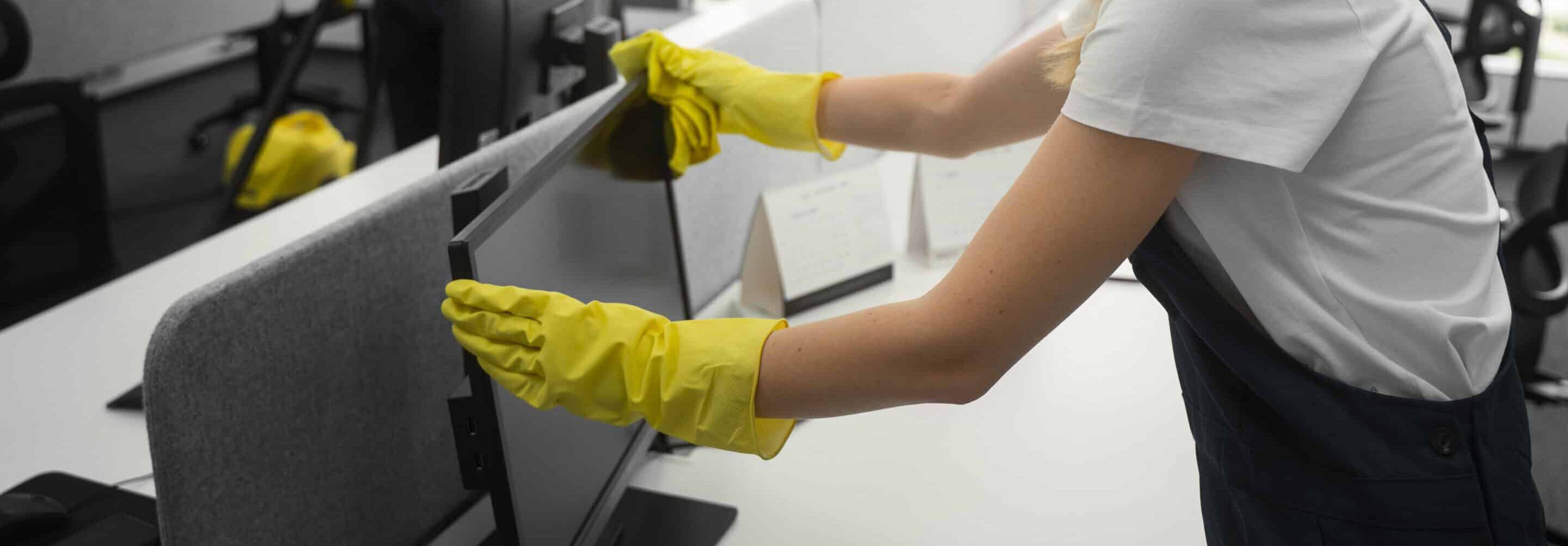Systematische Reinigung von Arbeitsplätzen, Besprechungsräumen und Sanitärbereichen.